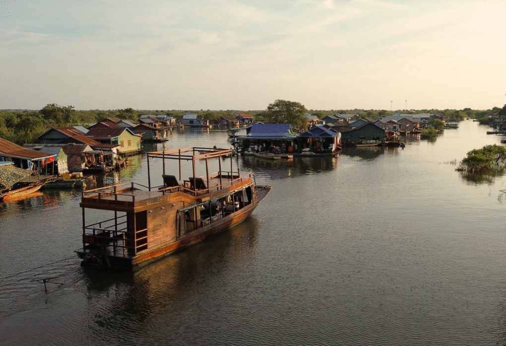 On the timeless waters of Tonle Sap, Chnneah Chivit—once a traditional fishing vessel, now meticulously reimagined—becomes an elegant floating sanctuary. Plush lounge seating invites unhurried conversation, while a discreet bar and curated canapés elevate the experience. As the boat glides effortlessly across the lake, floating villages drift by and fishermen return with their evening catch. The sky begins its transformation, warming to shades of gold and amber, reflected across the vast, mirror-like waters. Here, sunset is not simply watched, but felt—serene, expansive, and deeply atmospheric. It is a moment of stillness, where Cambodia’s great lake reveals its soul.