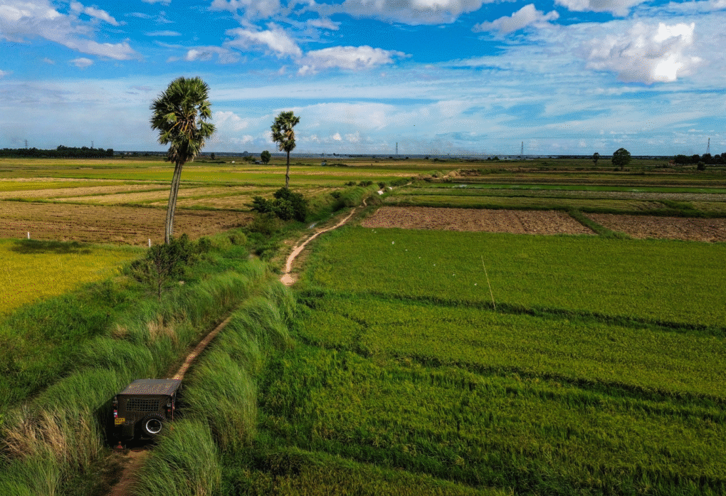 On land, the journey unfolds with a sense of adventure. A vintage jeep carries you beyond the city and into the heart of the countryside, where the pace slows and authenticity takes centre stage. Along the way, a quiet visit to a local Buddhist temple offers a rare and personal encounter with a resident monk—an opportunity for reflection and connection that grounds the experience in something meaningful. As the journey continues, rural Cambodia comes alive in the late afternoon light—rice fields glowing, palms swaying, and villages settling into the rhythm of evening.